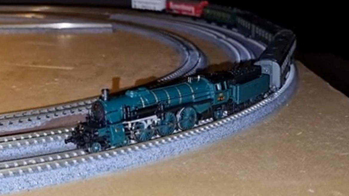 Am Übergang zwischen Epoche IV und V fährt der Schnellzug mit Minitrix-Wagen und den 218er Lokomotiven von Fleischmann:…
